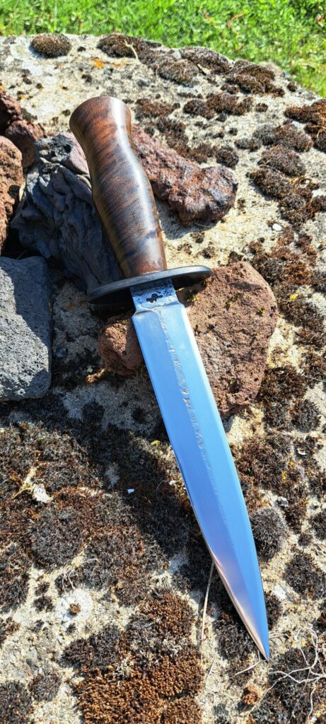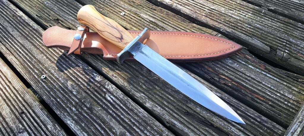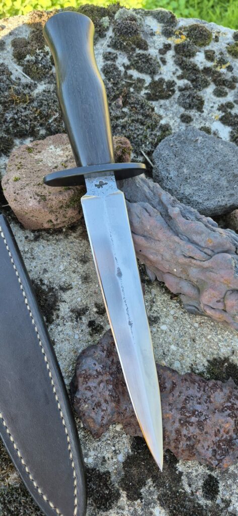 Dague mono-tranchant avec contre-tranchant affûté que j’ai conçu entièrement pour la chasse: mensuration, forme de lame et garde.